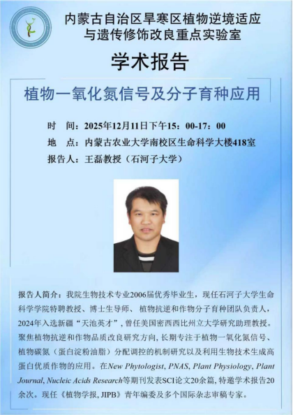 为进一步拓宽研究生学术视野,搭建优质学术交流桥梁,助力研究生科研能力提升,12 月 11 日下午,内蒙古农业大学生命科学学院联合内蒙古自治区旱寒区植物逆境适应与遗传修饰改良重点实验室,在南校区生命科学大楼 418 室成功举办主题为 “植物一氧化氮的信号及在作物育种中的应用” 的学术报告。本次报告特邀石河子大学生命科学学院特聘教授、博士生导师、我院 2006 届优秀毕业生王磊教授主讲,学院研究生及相关专业师生积极参与聆听。